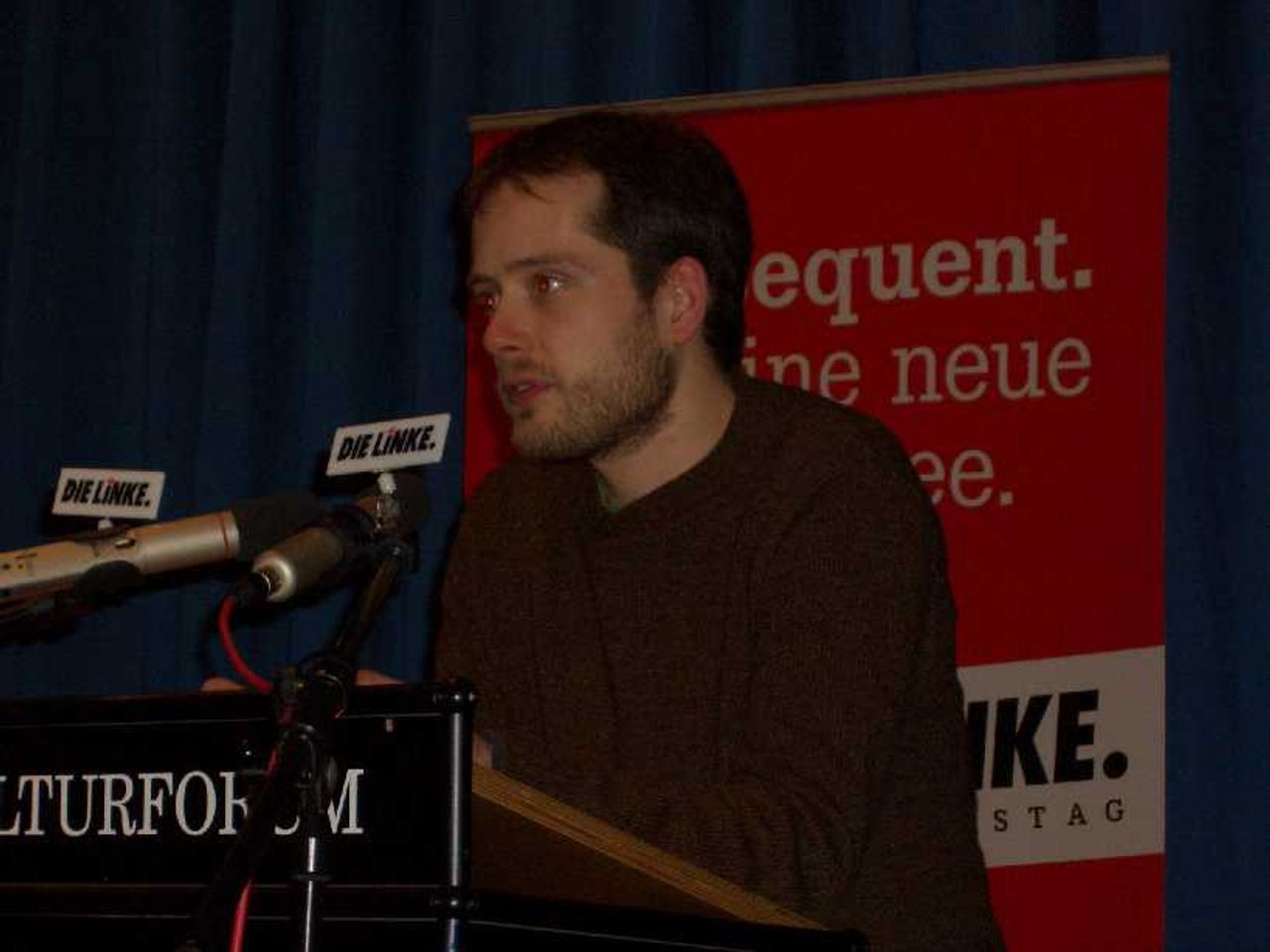 Am Ende des Vortrags ging Marius Heuser vom Parteivorstand der PSG ans Mikrofon und stellte Gysi zur Rede: "Ich bin aus Berlin" begann er seinen Beitrag, "und würde gern ein paar Bemerkungen zu der Glaubwürdigkeit der Linkspartei machen. Mir scheint es, dass die Linke - sobald sie an der Regierung ist - nicht SPD und Grüne nach links drückt, sondern selbst nach rechts rückt.