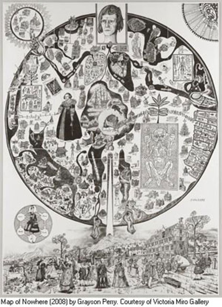 On the gallery wall opposite the tapestry was a large print, “Map of Nowhere” (2008), a pun on Thomas More’s Utopia (from the Greek ou-topos meaning “No Place”). It is based on the huge medieval Ebstorf map, but instead of Jesus Christ depicted as the body of the world with his head at the top of the map, Perry has substituted himself. In place of biblical quotations surrounding Jesus, Perry is assailed by hackneyed phrases such as “living-the dream” or “binge-drinking.”