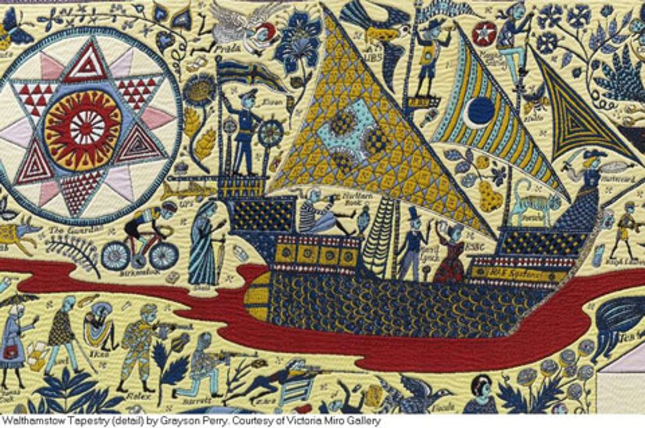 The tapestry was inspired by Perry’s interest in Sumatran batik designs and makes reference to the Bayeux Tapestry, the tale of the eleventh-century Norman Conquest of England, and to Walthamstow where the socialist and artist William Morris was born. Morris, according to Perry, “had this dilemma in that he wanted things to be beautiful and handmade and yet that immediately made them so expensive that only the rich could afford them.” He hopes that this dilemma will be overcome by Internet and digital technology delivery systems that “will free the individual maker craftsman-artist from the need to have a factory or a huge infrastructure.” “The Walthamstow Tapestry” was woven by a huge computerised loom in Belgium to Perry’s design.