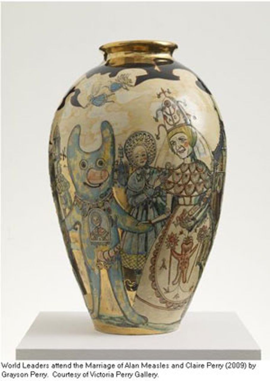 On another pot, “World Leaders Attend the Marriage of Alan Measles and Claire Perry” (2009), the artist unites two of his recurring images, a teddy bear and himself dressed in women’s clothes, to whom Barack Obama, Gordon Brown and Nicolas Sarkozy pay homage. The ceremony represents a comic reconciliation between the struggling masculine and feminine sides of Perry’s nature, which lay behind much of his past work and helped produce its graphic and often violent sexual imagery. Perry seems a much happier person these days.