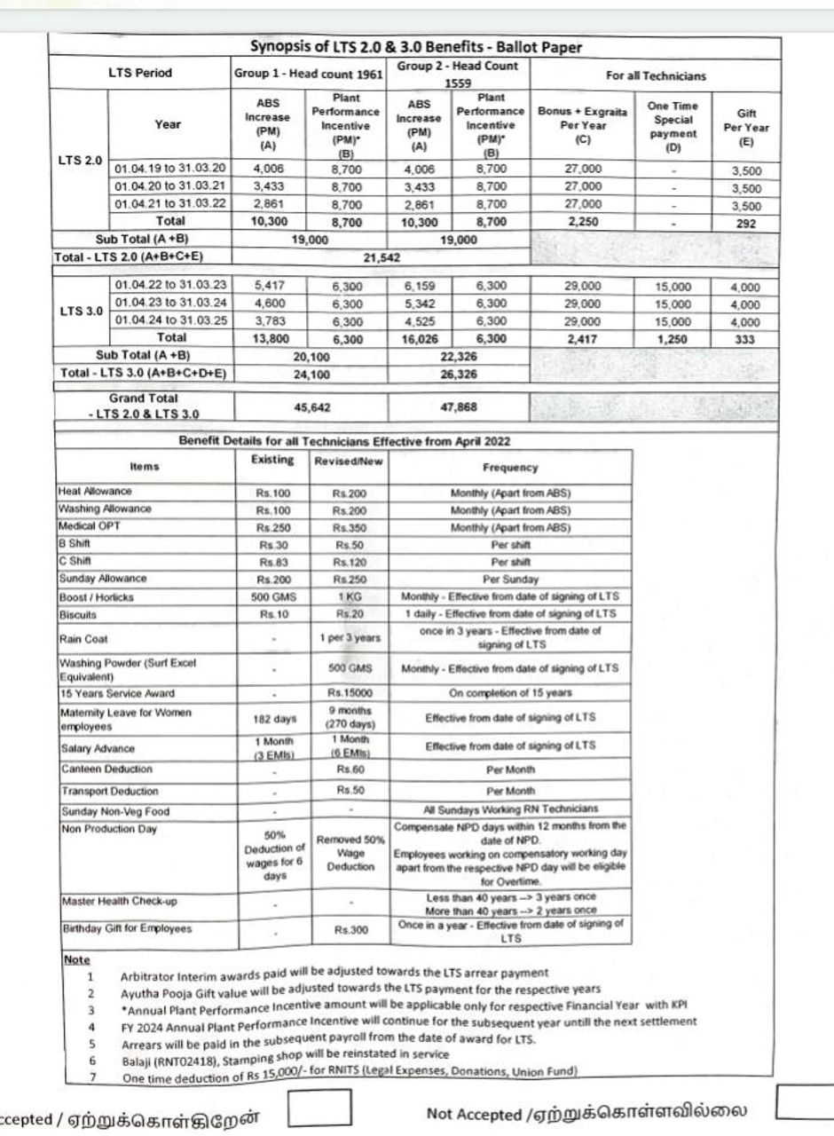 2019 ஏப்ரல் முதல் 2025 மார்ச் வரையிலான ஆறு ஆண்டு காலத்தை உள்ளடக்கிய, இரண்டு அடுத்தடுத்த மூன்று வருட ஒப்பந்தங்களுக்கு, ஆதரவாக 2,333 தொழிலாளர்கள் வாக்களித்ததாகவும் எதிராக 781 பேர் வாக்களித்ததாகவும் தொழிற்சங்கம் கூறிக்கொள்கின்றது.
